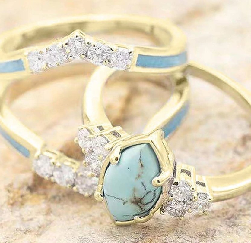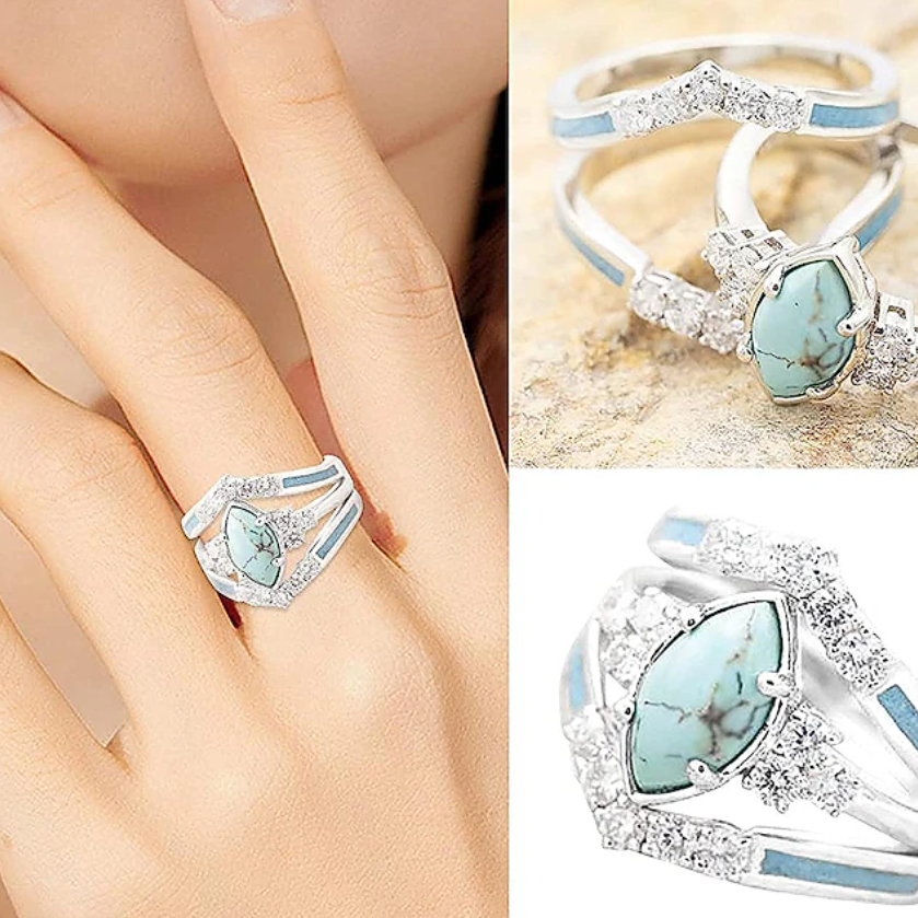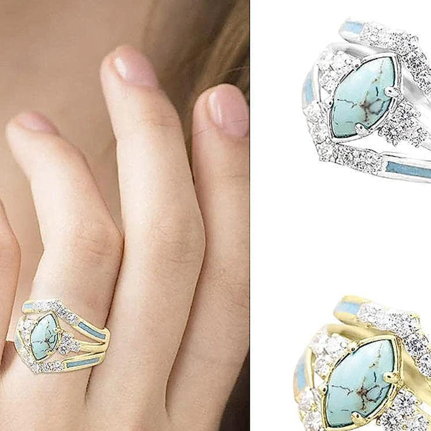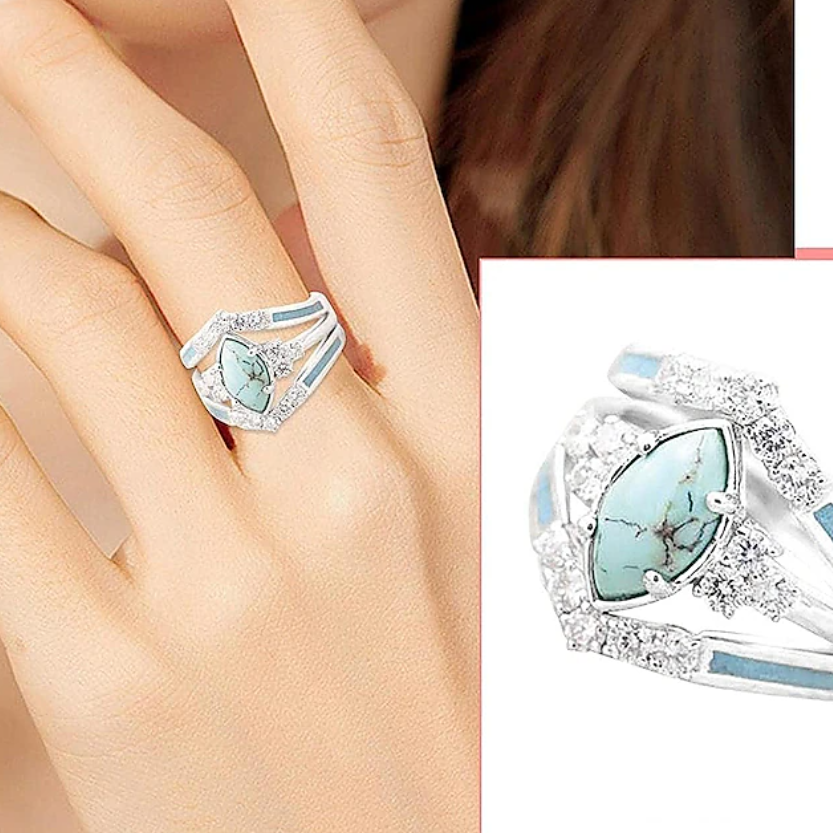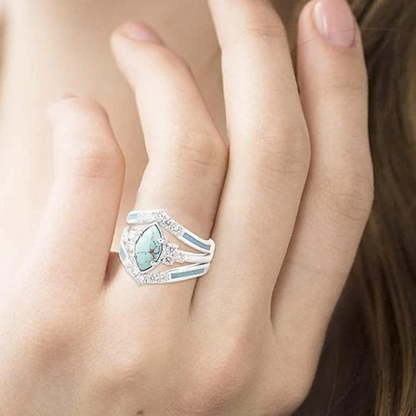 [Ontwerp]: Het middelpunt van deze opmerkelijke ring is een marquise-vormige turkoois steen bekend om zijn onderscheidende blauw-groene tint en ingewikkelde adering. De ring is gezet in een ongerepte zilveren band en is versierd met een halo van fonkelende zirkonia kristallen, die de algehele elegantie en glamour versterken. De band zelf heeft ingelegde turquoise details, die de centrale steen prachtig aanvullen en bijdragen aan de artistieke flair.